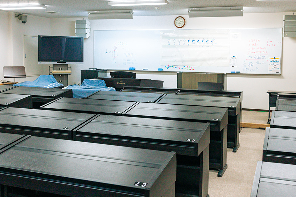ヘッドフォンマイクを使い、先生と生徒がマンツーマンでレッスンできる最新の教育システム(ミュージックラボラトリー・システム)です。