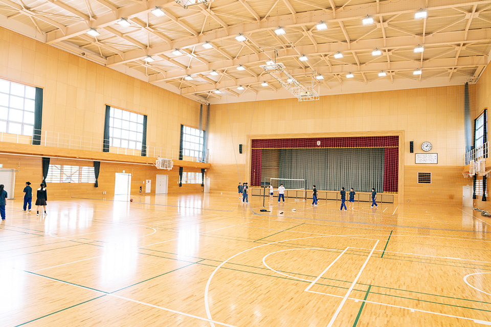 平成28年12月、新しい体育館が完成いたしました。学校行事やクラブ活動など多くの場面で使用します。全館LED照明の明るい体育館で思う存分活動が行えます。